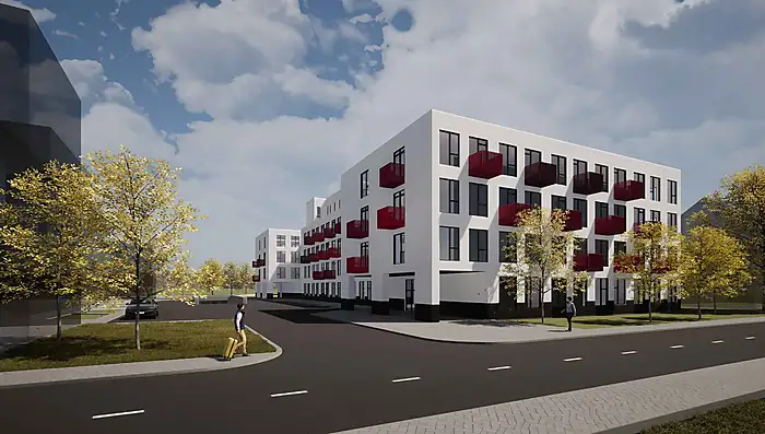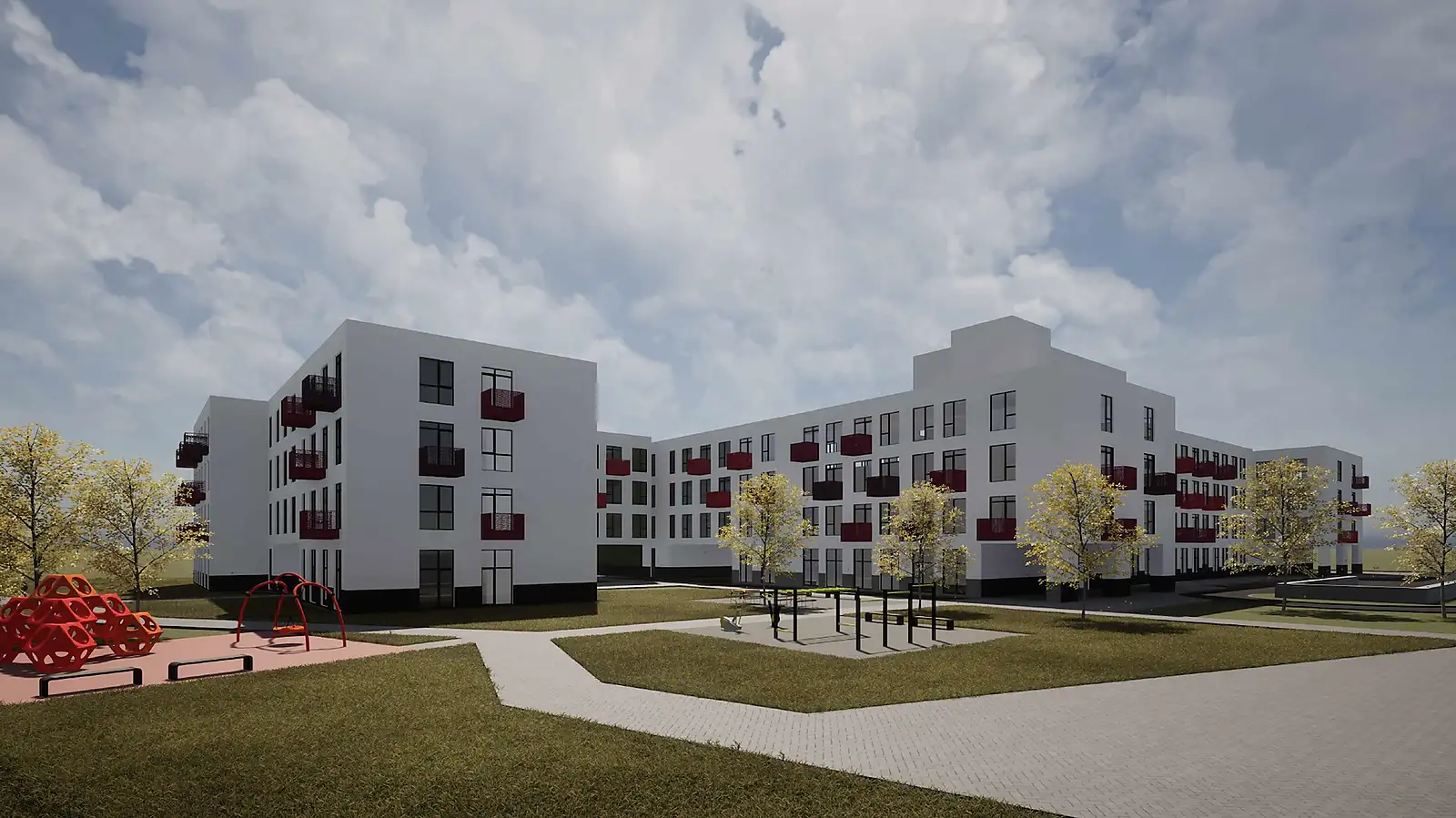Ēku ansamblis ieturēts vienotā stilā – tās ir sešstāvu ēkas, kas satsāv no ekonomiskās klases numuriņiem/dzīvokļiem ar nelielu platību, tās ārējā apdare – dekoratīvs apmetums gaišos toņos, kā akcenti fasādēs tiek veidoti balkoni, kam paredzēts izmantot krāsainu metāla režģi kā balkona norobežojošo daļu, pie kam režģis tiek veidots ar atšķirīgu krāsu gammu, kas fasādēs veido krāsu pāreju ritmu.