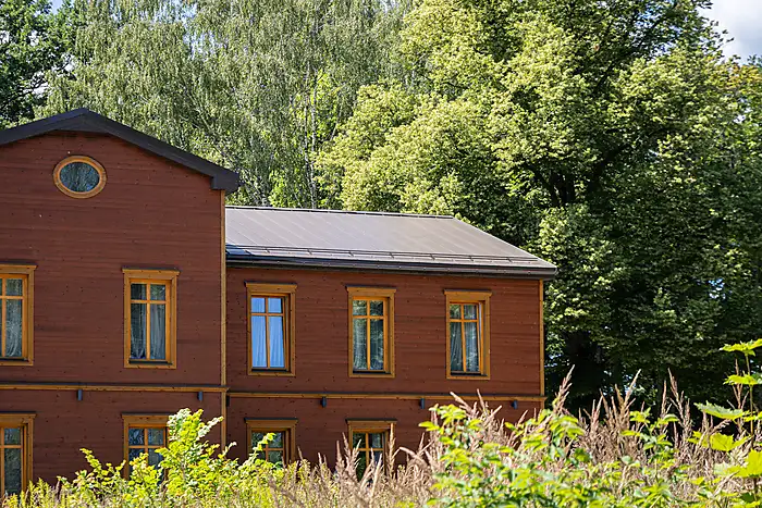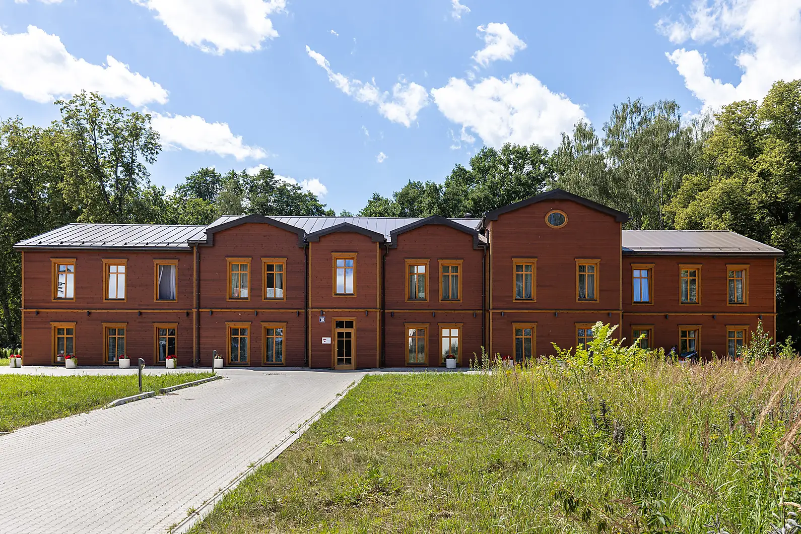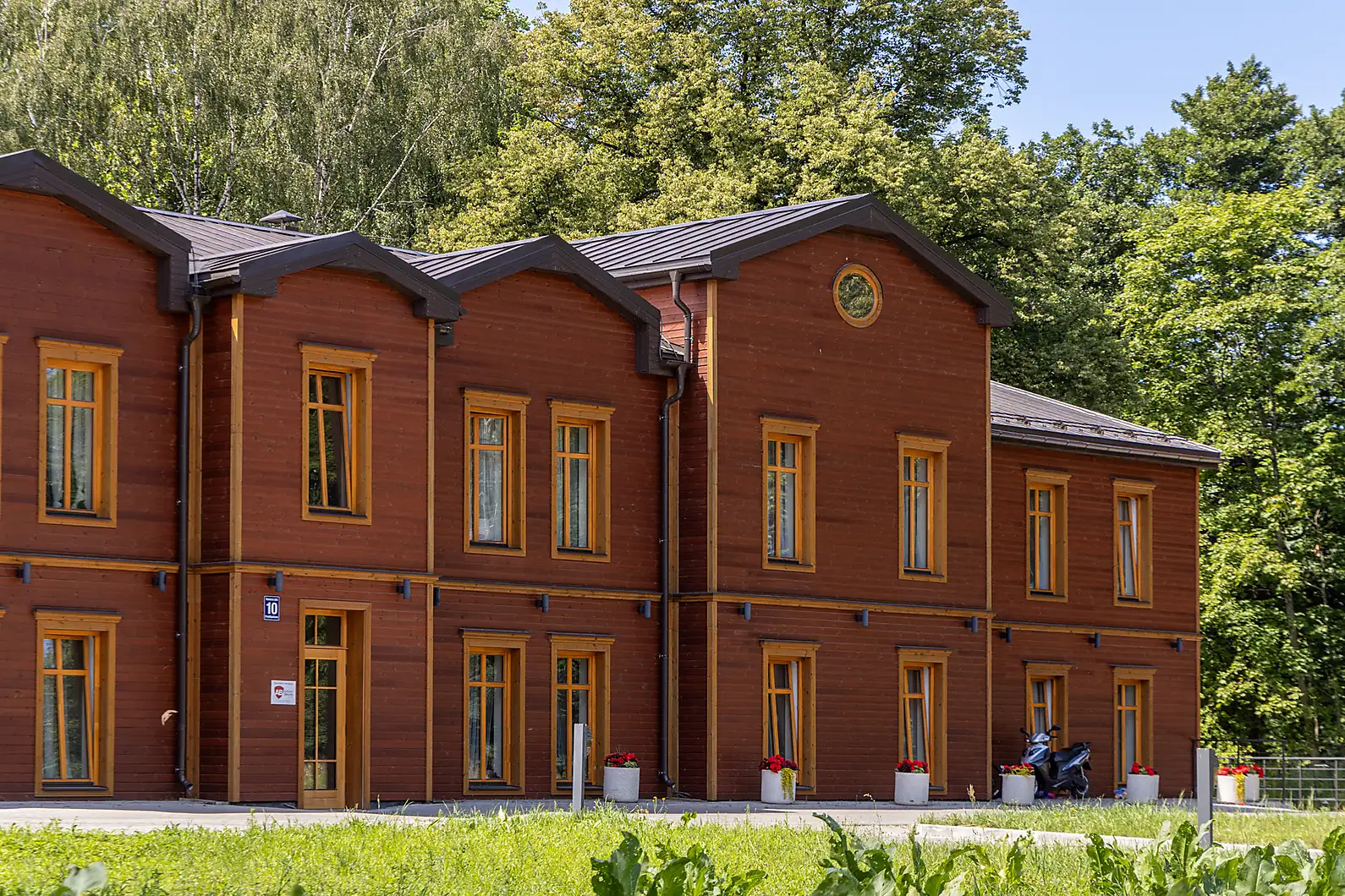 Netālu no Mārupītes krasta slejas rekonstruēta divu stāvu koka ēka jeb jaunā Bieriņu muiža.