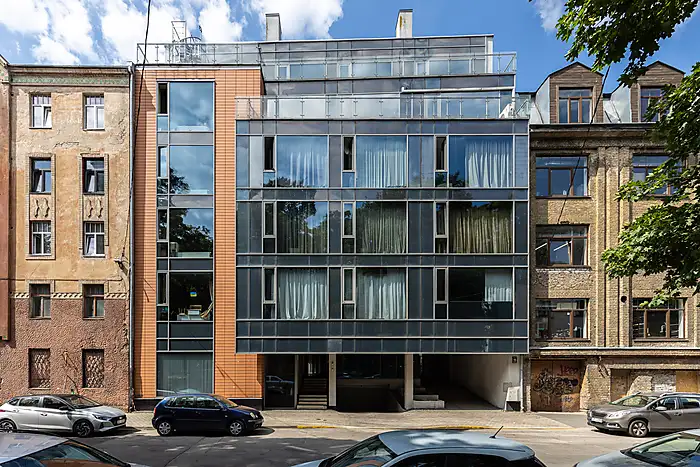 Ēkas 1. stāvā izvietotas sabiedriska rakstura telpas. No 2-6 stāvām - 17 dzīvokļi ar platībām 44 - 125 m2.