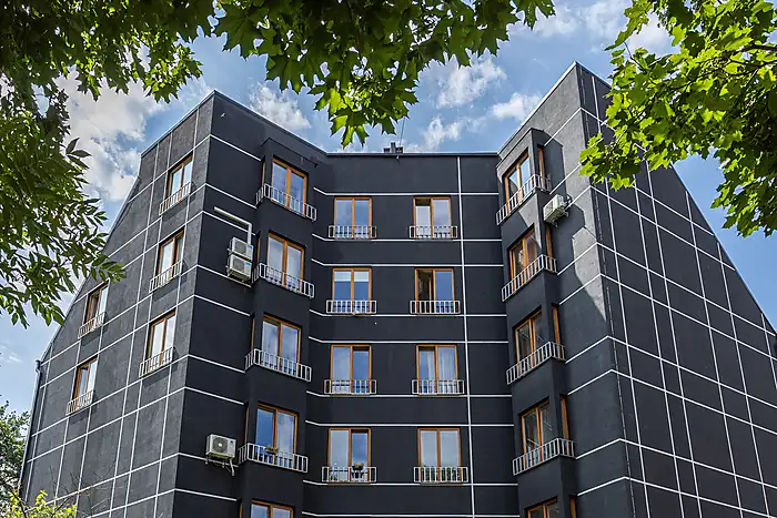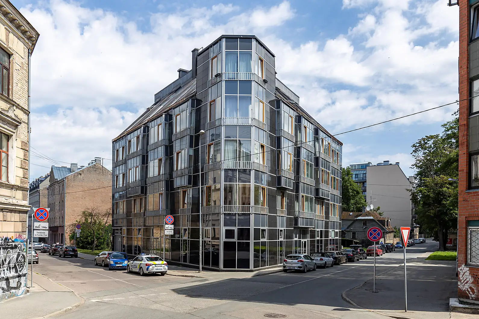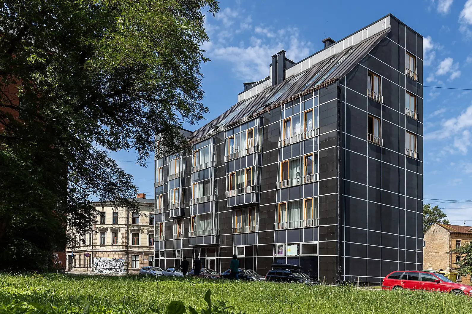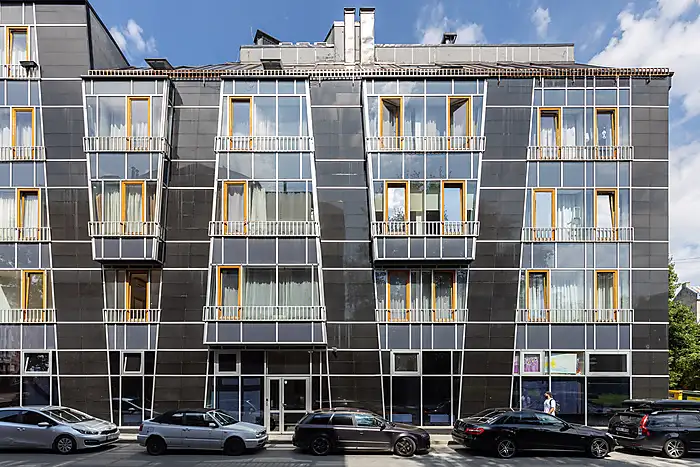Ekskluzīva ēka ar stikla fasāžu sistēmu, kas papildināta ar tumšu granītu.